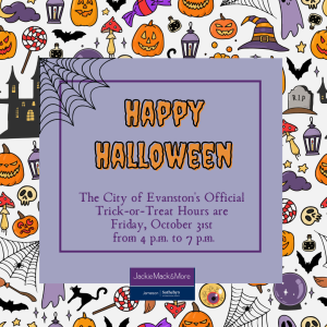 Trick-or-Treating, Evanston-wide, Friday, October 31st: Hours 4:00 to 7:00 p.m. If you’re participating, please turn on your porch lights on. And you might want to on your porch or steps to hand out your candy or individual goodie bags. If you are not handing out goodies, however, you might want to turn off your lights off and have a sign on your door. Finally, if you’re out and about, be aware that many young ghouls, ghosts, princesses, and pop stars will be taking over the streets, so please drive extra carefully.